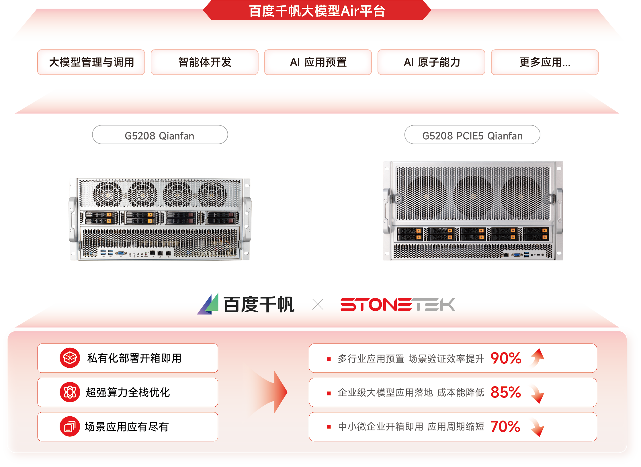 G5208 Qianfan基于STONETEK SuperSvr G5208 AI智算服务器平台,预装百度千帆大模型Air版软件环境,提供从算力、AI框架、推理能力到应用的全栈大模型能力。预置模型服务deepseek+文心系列+第三方模型,组织架构与权限管控(用户、架构、用户组、授权),应用知识库、自主规划agent、 prompt工程,插件管理,基础管控等。