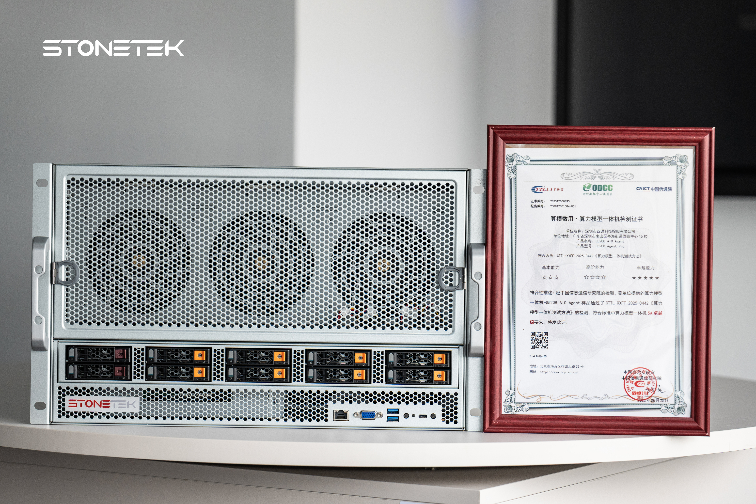 基于STONETEK SuperSvr G5208 AI智算服务器平台打造的一系列开箱即用的AI一体机解决方案产品。针对不同应用场景搭载定制化软件与功能组件,覆盖从模型推理、知识库管理到智能体开发等多种业务场景,帮助企业快速构建私有化AI平台,降低部署与运维复杂度,获得中国信通院“算模数用一体机”5A卓越评级。